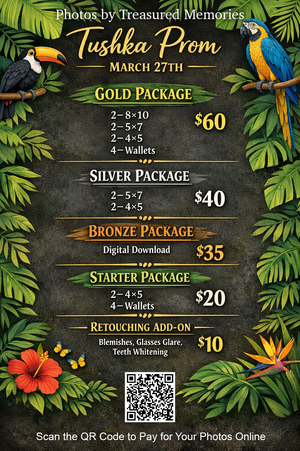 Prom Pictures by Treasured MemoriesTreasured Memories will be set up to take pictures during the Prom this Friday, March 27th. Below you will find the list of the packages available and a qr code y...
