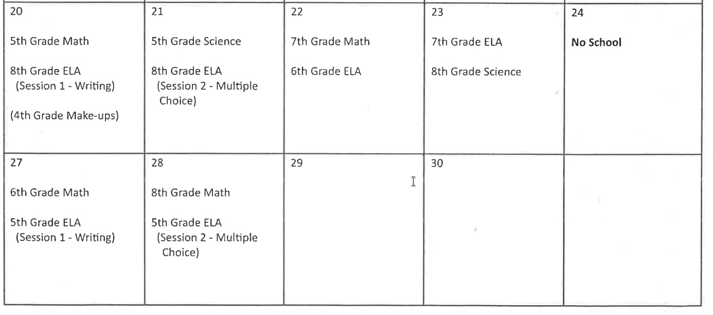 End of Year State Testing REMINDER: End of Year State Testing will begin for the 5th-8th grades on Monday, April 20th. The image below shows a calendar listing the grades that will be testing each ...